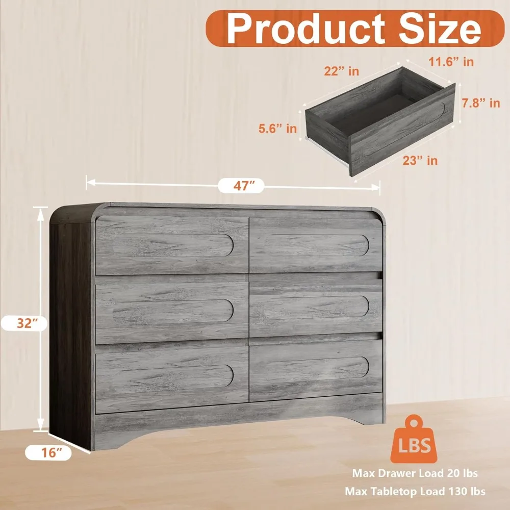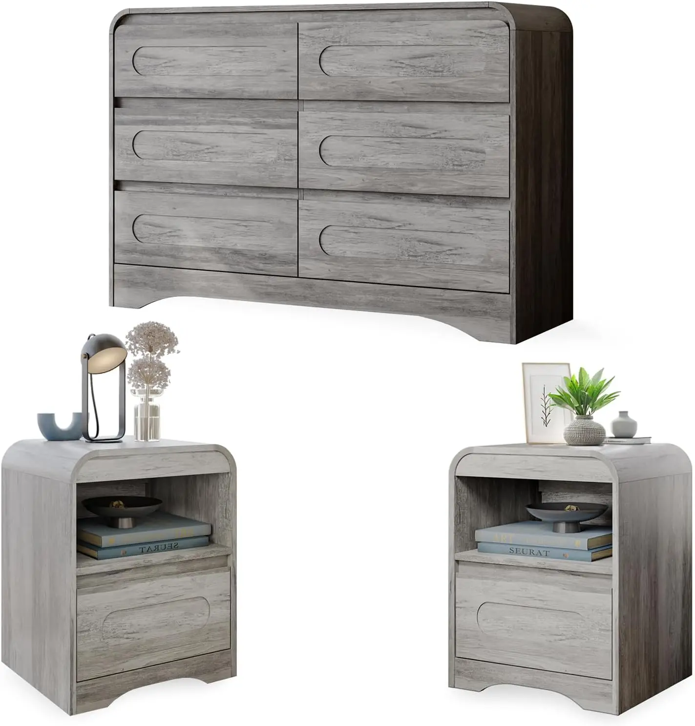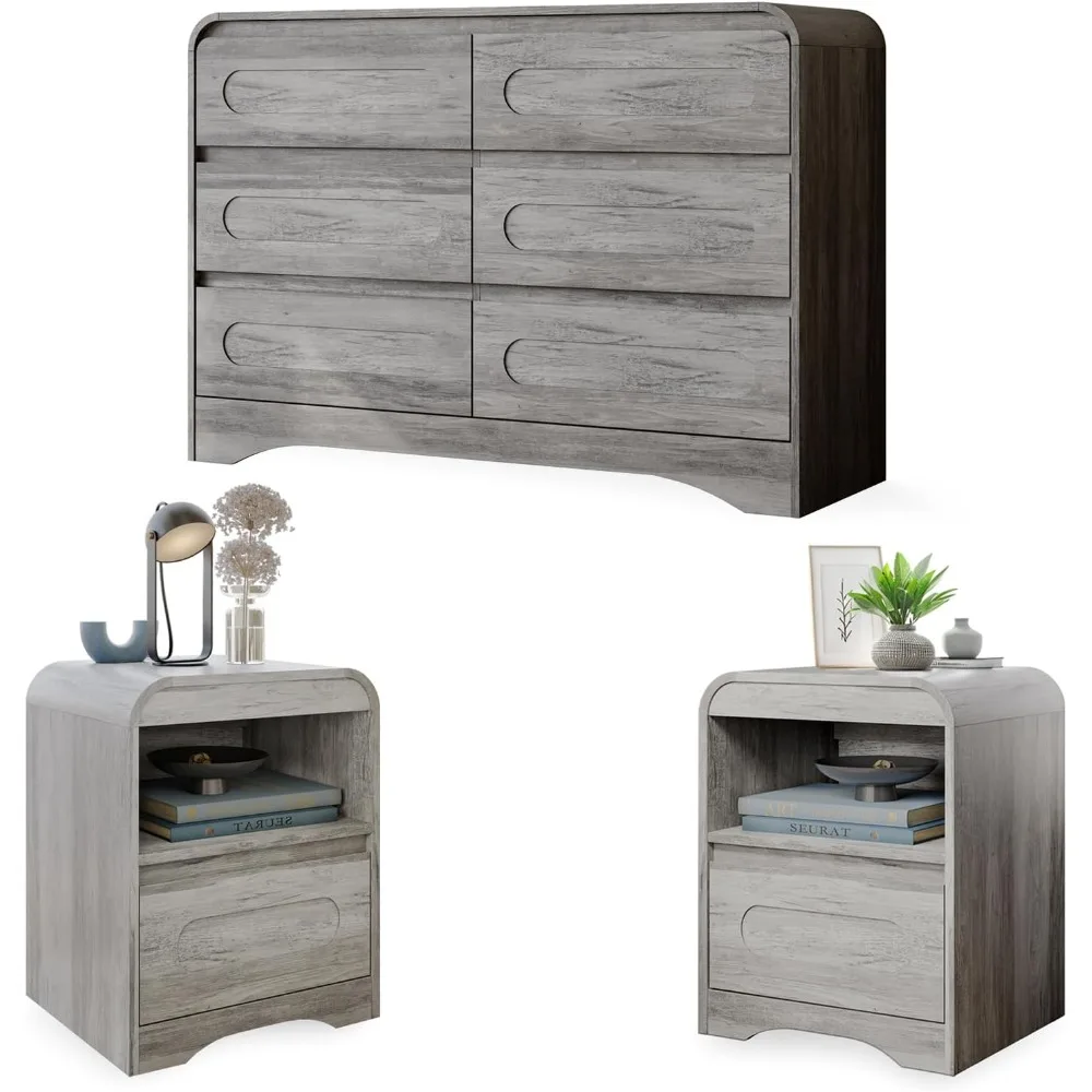 Modern Wooden Bedroom Set: Included 1pc wide 6 drawer chest and 2pcs side tables. our furniture showcases exquisite wood grains that enhance authenticity and modern charm. the same style and harmony, no need to worry about mismatching, the matching design ensures perfect harmony in your space – no more mismatched furniture Wide 6 Drawer Dresser Size: This beautifully crafted modern dresser features a spacious (47″W x 15.7″D x 32″H), making it the perfect dresser for bedroom or living space. The wide 6-drawer dresser design maximizes storage without compromising on style, while its weathered finish adds authentic rustic charm to any interior Nightstand Set Size: Our nightstands are designed to fit seamlessly into any room. Measuring 17.7″W x 15.7″D x 22″H, this night stand set of 2 is the ideal choice for small spaces. despite the compact size, these bedside tables offer a spacious top, a drawer, and an open shelf, providing practical storage without taking up too much room Versatile Dresser Set: Whether used as a dresser for bedroom storage, an entryway organizer, or a living room accent, this versatile dresser sets adapts effortlessly. Its functional versatile dresser sets layout keeps essentials neatly stowed, while the compact footprint fits seamlessly in any room Packaging and Assembly: Bedroom suite comes in 2 individually wrapped packages and may arrive on different days. Detailed installation instructions and numbered parts are included in the package and can be installed in less than 2 hours Modern Wooden Bedroom Set: Included 1pc wide 6 drawer chest and 2pcs side tables. our furniture showcases exquisite wood grains that enhance authenticity and modern charm. the same style and harmony, no need to worry about mismatching, the matching design ensures perfect harmony in your space – no more mismatched furniture Wide 6 Drawer Dresser Size: This beautifully crafted modern dresser features a spacious (47″W x 15.7″D x 32″H), making it the perfect dresser for bedroom or living space. The wide 6-drawer dresser design maximizes storage without compromising on style, while its weathered finish adds authentic rustic charm to any interior Nightstand Set Size: Our nightstands are designed to fit seamlessly into any room. Measuring 17.7″W x 15.7″D x 22″H, this night stand set of 2 is the ideal choice for small spaces. despite the compact size, these bedside tables offer a spacious top, a drawer, and an open shelf, providing practical storage without taking up too much room Versatile Dresser Set: Whether used as a dresser for bedroom storage, an entryway organizer, or a living room accent, this versatile dresser sets adapts effortlessly. Its functional versatile dresser sets layout keeps essentials neatly stowed, while the compact footprint fits seamlessly in any room Packaging and Assembly: Bedroom suite comes in 2 individually wrapped packages and may arrive on different days. Detailed installation instructions and numbered parts are included in the package and can be installed in less than 2 hours