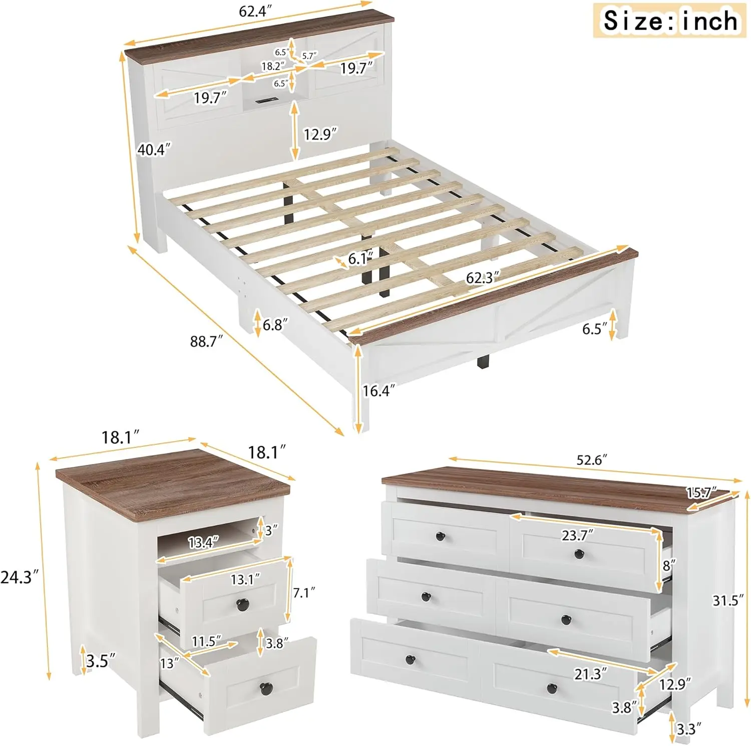 • [Dimensions and Assembly] Dimension: Platform Bed: 88.7″L X 62.4″W X 40.4″H. Nightstand: 18.1″L x 18.1″W x 24.3″H. Dresser: 52.6″L x 15.7″W x 31.5″H. This bedroom set comes with detailed instructions that can be followed step by step to help you complete the assembly as quickly as possible. This bed frame is compatible with Queen size mattresses (mattress not included), no box spring required. 10 bed slats provide good support for the mattress, Load bearing can reach 700LBS.