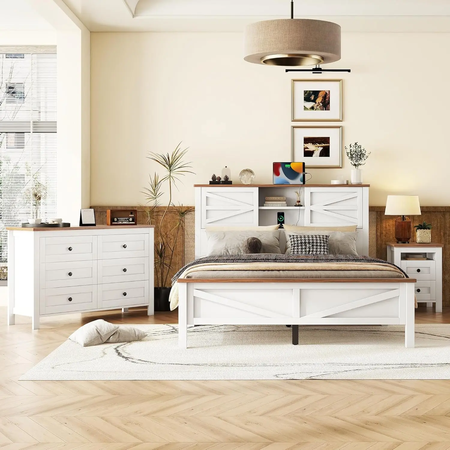 • [Stylish Design] This set exudes a classic and understated aesthetic, perfect for creating a sophisticated and serene bedroom environment. The wooden bed boasts clean lines and a sleek silhouette, complemented by the simple yet stylish bedside table and dresser. This sliding door storage headboard provides ample space to store your essentials, keeping your bedroom tidy and maximizing every inch of space. This feature ensures that your belongings are always within reach yet neatly concealed.