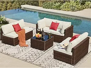 - 【Versatile Configurations for Every Occasion】Easily adapt this outdoor patio furniture to various styles to suit any occasion. Our 7 pieces Outdoor Sectional Sofa Set offers endless possibilities for customization, including L-shaped and U-shaped arrangements. This versatility empowers customers to effortlessly adapt their outdoor space to their preferences and needs, whether they’re entertaining guests, relaxing with family, or simply enjoying the outdoors.