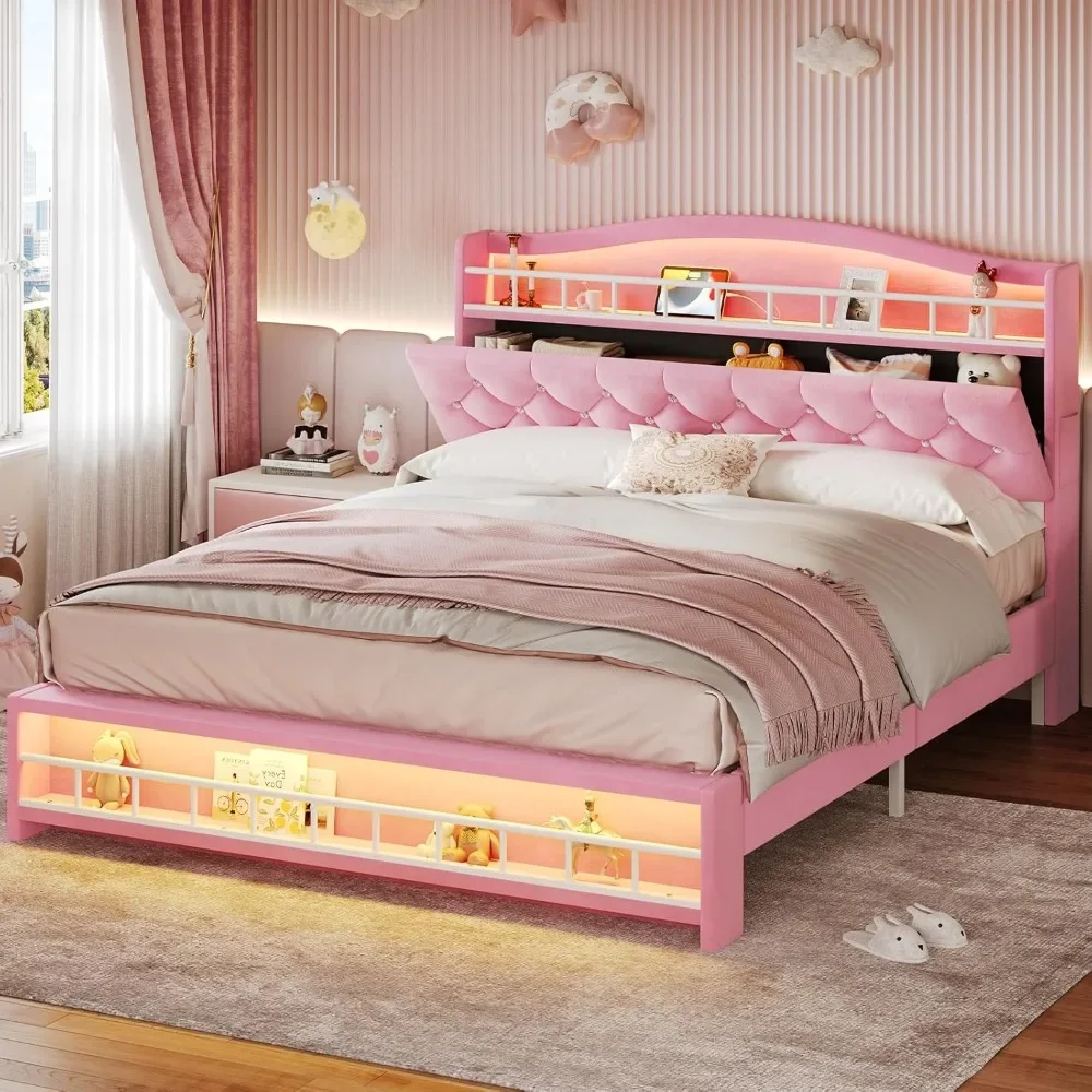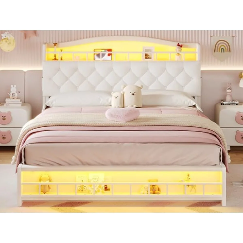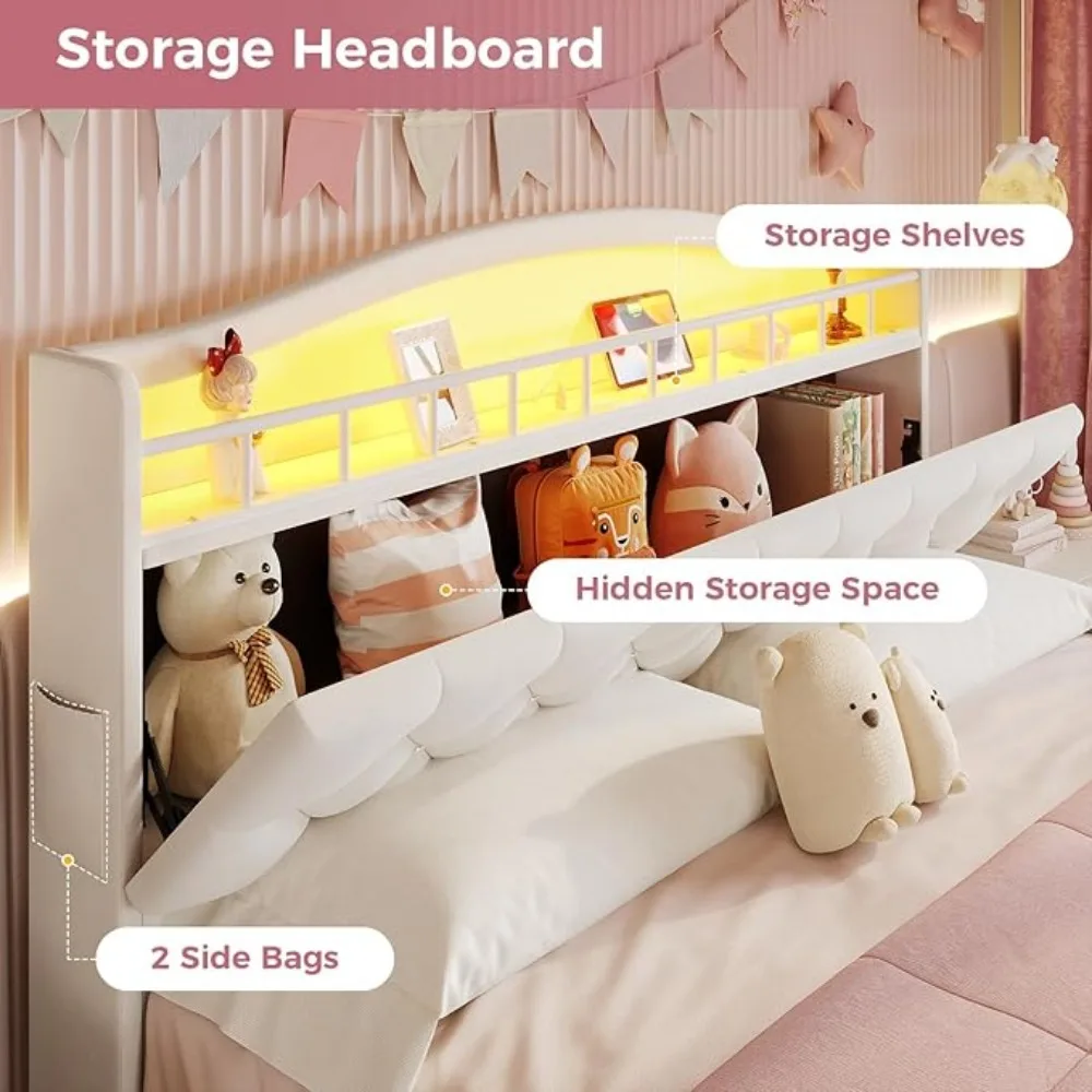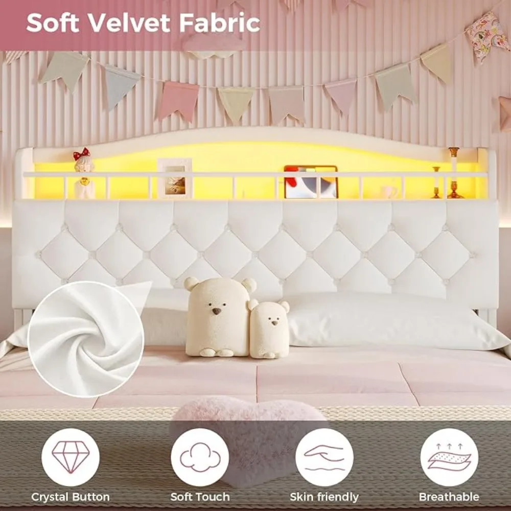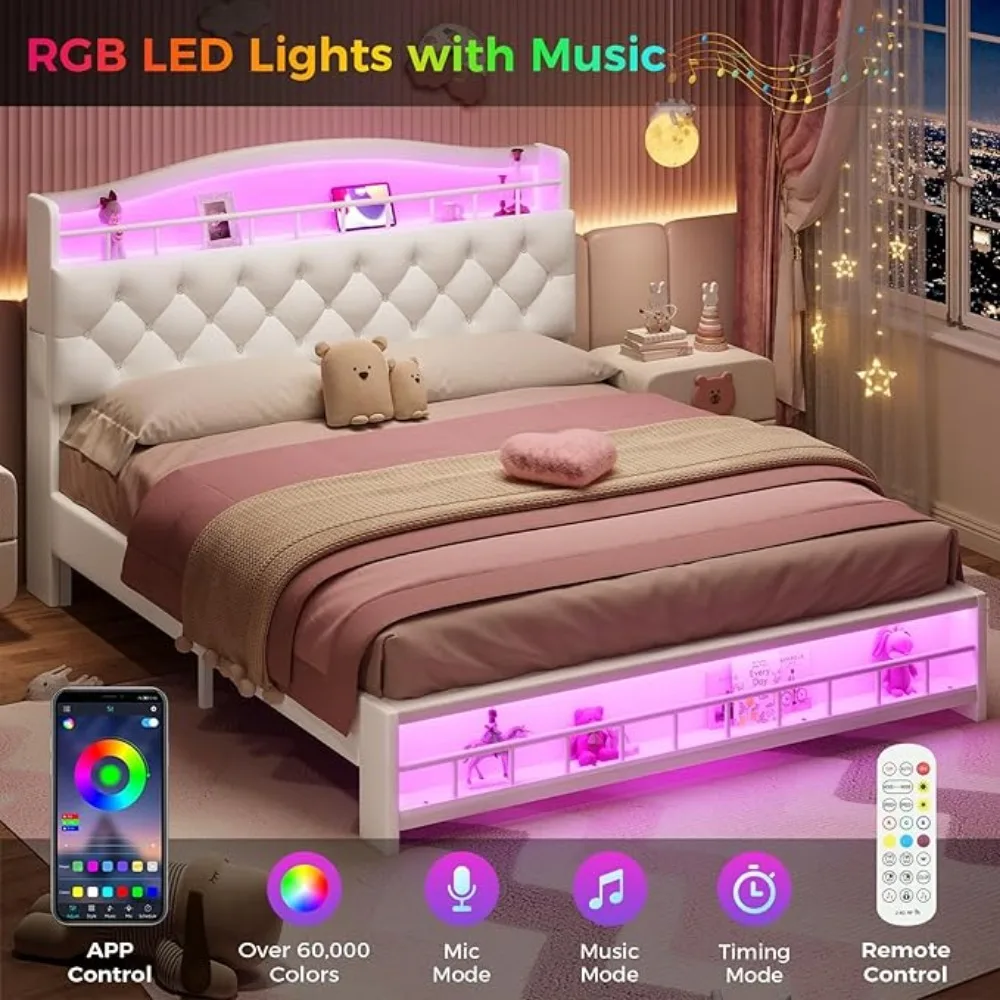 - RGB LED Lights on Headboard & Footboard: The girls bed equiped with colorful RGB LED lights in headboard and footboard, easily control with remote or APP, comes with various color options and flsahing options. Over 60000 colors, static and dynamic modes, mic mode, music mode, timing mode, offers a nice ambiance for your bedroom, brighting up your nignt.