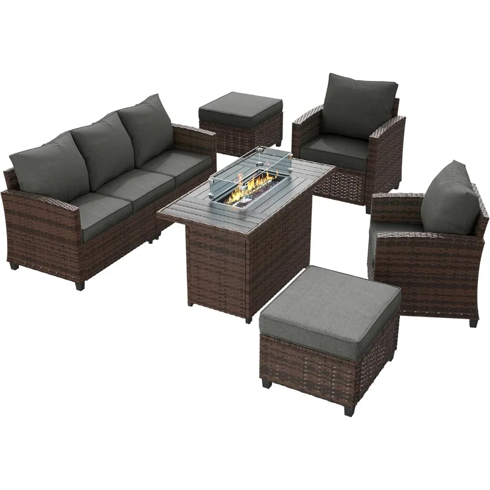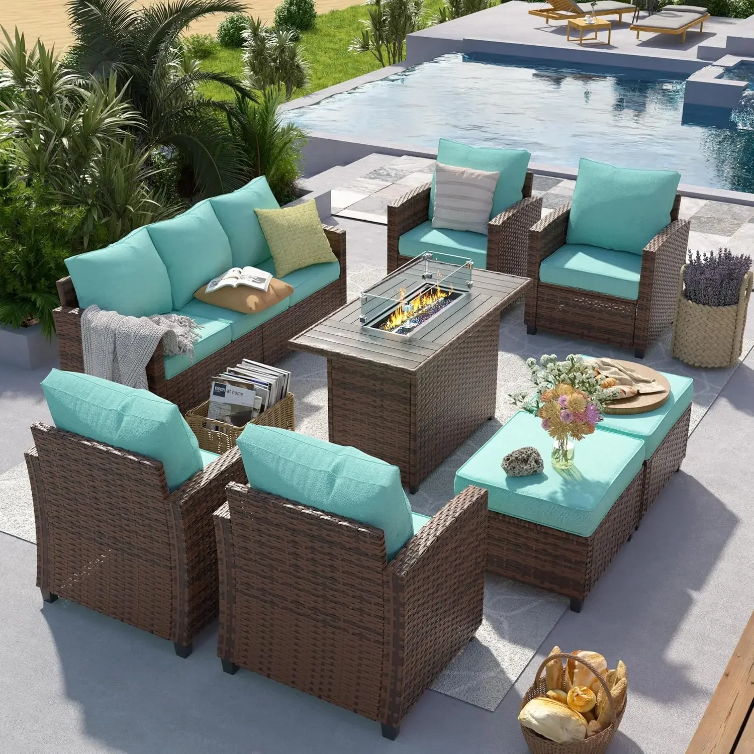 - 【OUTDOOR FURNITURE SET】Including 2 x single chairs, 2 x ottomans, 1 x 3 seater couch,1 x 44″ gas firepit table, matching seat cushions, and pillows. Perfectly fitting with your backyard, poolside, porch, garden, and deck to create an outdoor comfort zone for you.