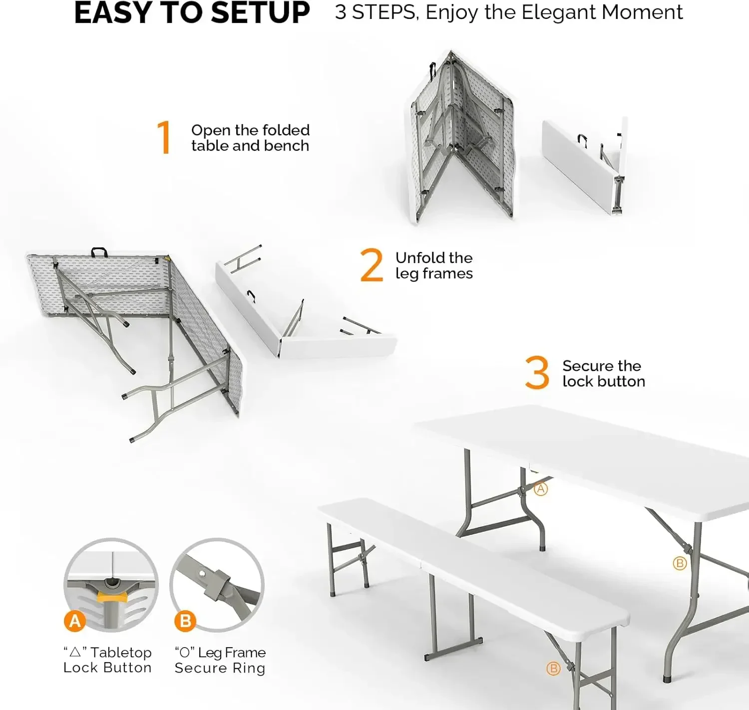 • Quality and Sturdy: This 6ft long table and bench three-piece set is made with high capacity HDPE waterproof material, ensuring durability and stability. The non-slip matte surface provides a secure grip, and the sturdy triangular structure support and robust metal frame offer added strength. The fixed structure secure locks and anti-tipping safety design further enhance stability and safety