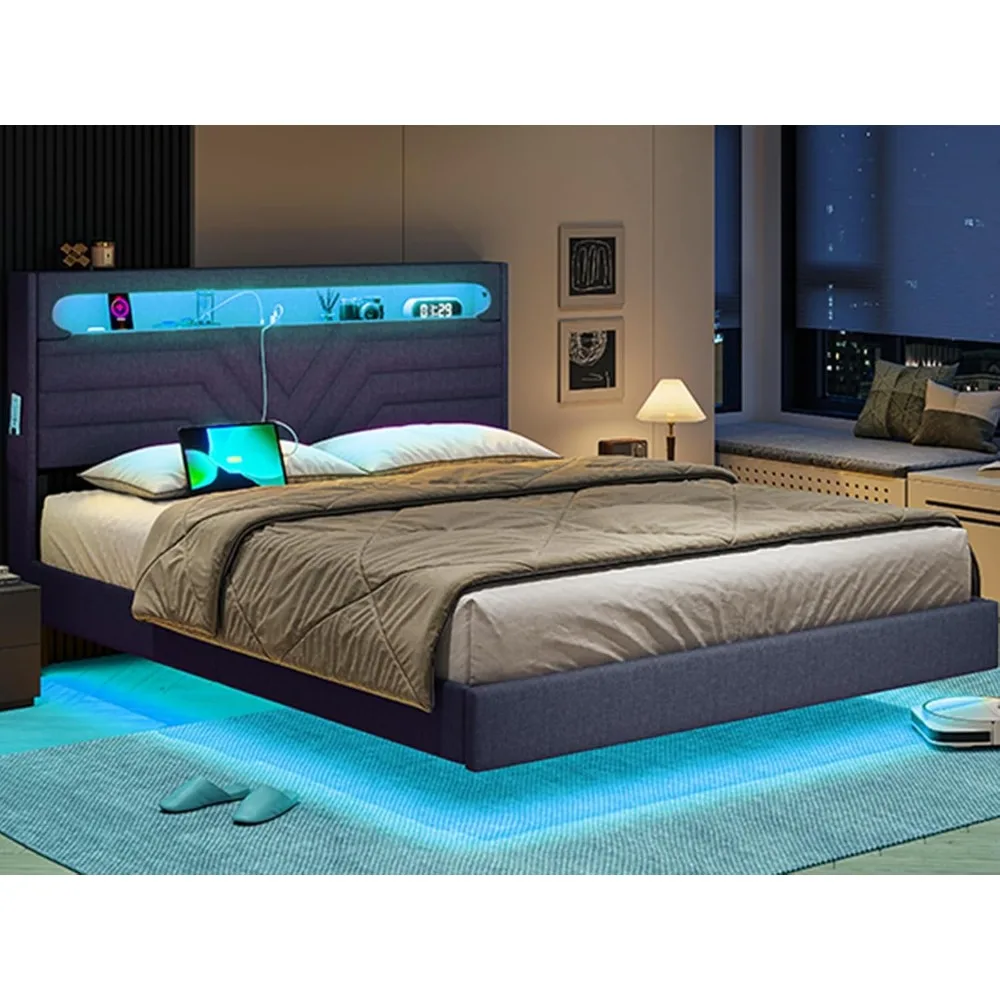 Queen Floating Bed Frame with RGB LED Lights Headboard USB-C/A Power Combo Linen Upholstered Platform Bed with Storage Headboard