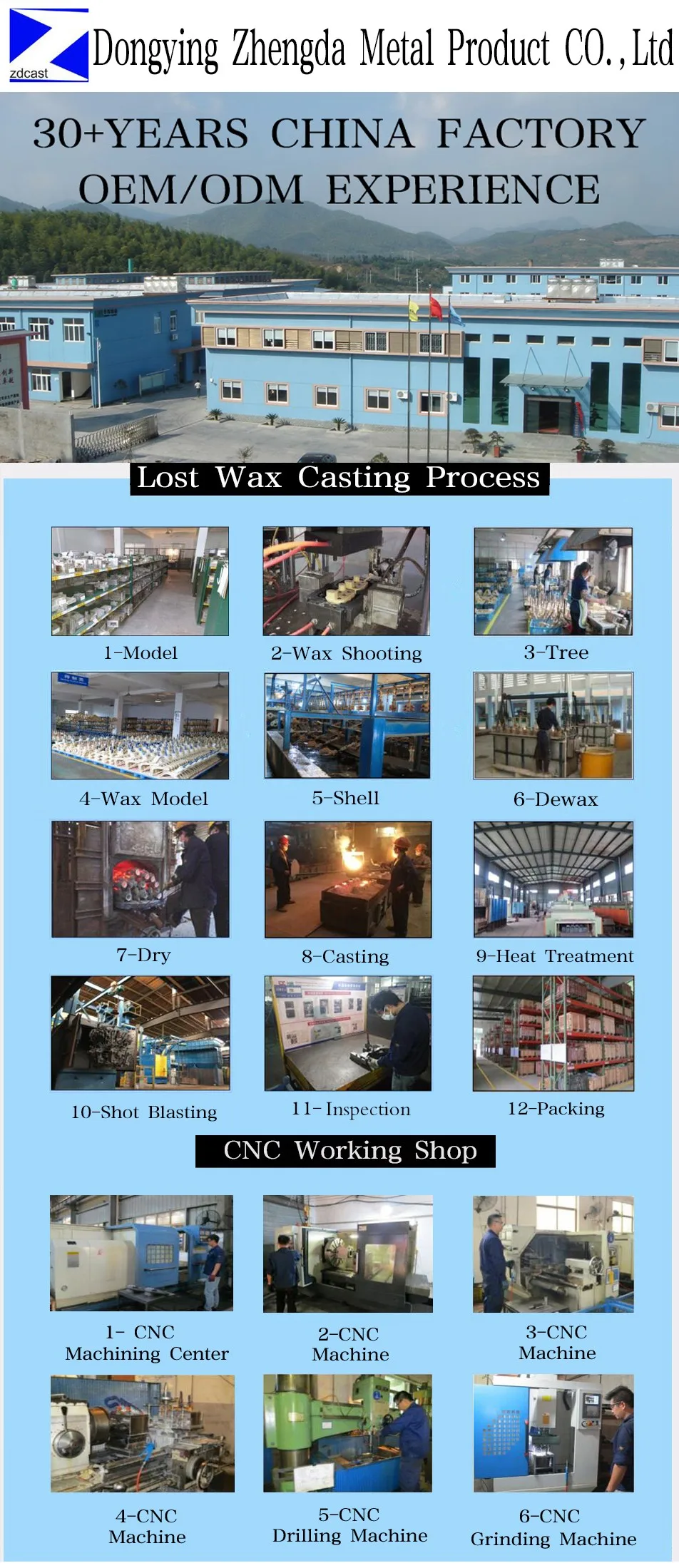 We have two factories. One is for lost wax casting products in Dongying City,another is for CNC machining process , laser cutting etc service in Dongying City. More than 300people .